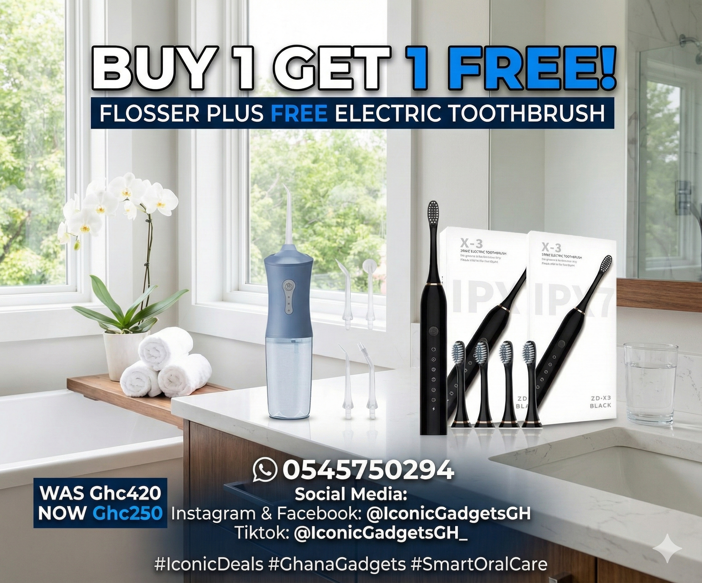 Upgrade your daily oral hygiene with the Iconic Smart Oral Care Combo, a premium 2-in-1 package designed for convenience and professional-level cleaning. This bundle includes a powerful water flosser with three interchangeable nozzle tips for precise plaque removal and gum care, plus a sleek electric toothbrush with five replacement brush heads for long-term use. Engineered for efficiency, the flosser delivers deep cleaning between teeth while the toothbrush ensures thorough polishing of enamel. Together, they provide a complete oral care solution that’s perfect for home or travel. Enjoy the Buy 1 Get 1 Free offer at an unbeatable price, making advanced oral care accessible to everyone.
